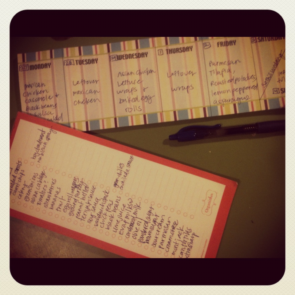 4. Have fun getting organized! Christie always had a big dry erase white board calendar where she recorded her meal plan. I posted a picture of the method to my madness above. I’ve tried apps and digital list makers, but there is just something I love about writing out my own list. I have a magnetic list on the fridge where I write random things I think of through out the week or things that I run out of. During the week, I type meal ideas and ingredients into a Google Tasks list. The day before I will be doing my shopping, I plan out 5-6 full meals, make my shopping list, look at my Google Calendar and input when I will eat which meals there, and then write them out on my weekly paper magnetic pad so I see it every day on the refrigerator.