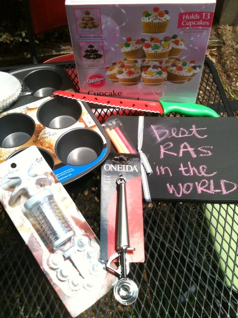 My RAs not only know me, but they listen to me! Almost everything they got me was something I barely remember mentioning in conversations that I wanted or wished I had. They got me a cookie scoop, jumbo muffin tin, jumbo muffin cups, a cupcake decorating kit, a cupcake display tree, a watermelon knife AND chalkboard place mats (MY FAVORITE – you’ll see these on the blog OFTEN).