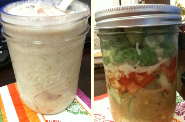 For lunch and breakfast this week, I’m obsessed with jars. I got some wide mouth pint mason jars and they are perfect for the popular Overnight Oats cold oatmeal concoctions for breakfast and jar side salads for lunch.