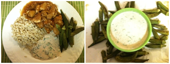 Crock Pot Apple BBQ ChickenPerfect Brown Rice, and Not So Fried Okra with Spicy Scallion Dipping Sauce