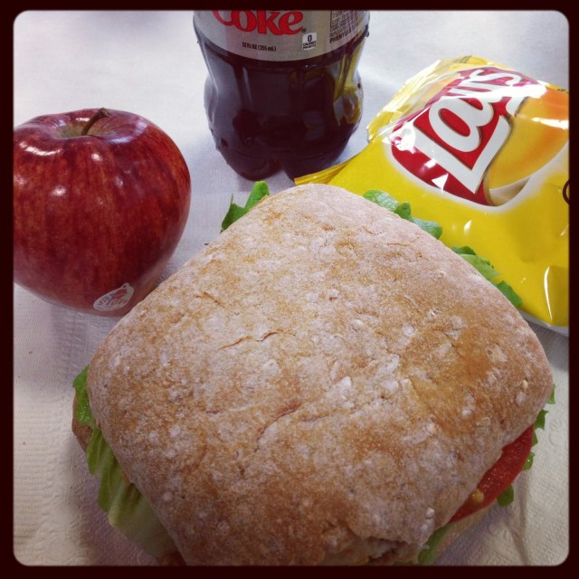 | free lunch! chicken pesto sandwich + apple + unhealthy chips (hey, it was free!) |