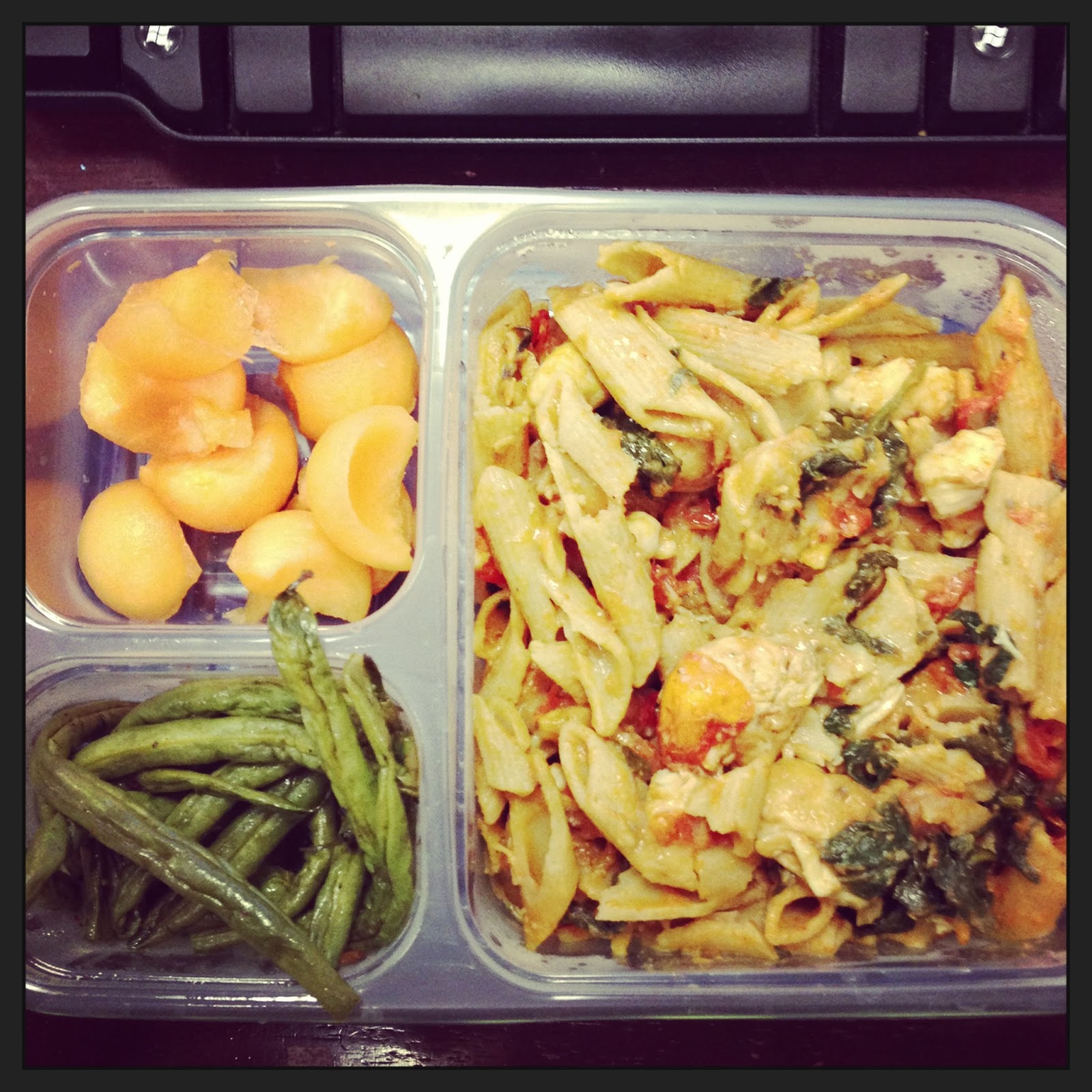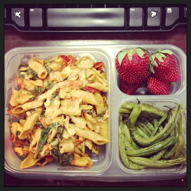 | leftover chicken florentine pasta + leftover roasted green beans + strawberries |