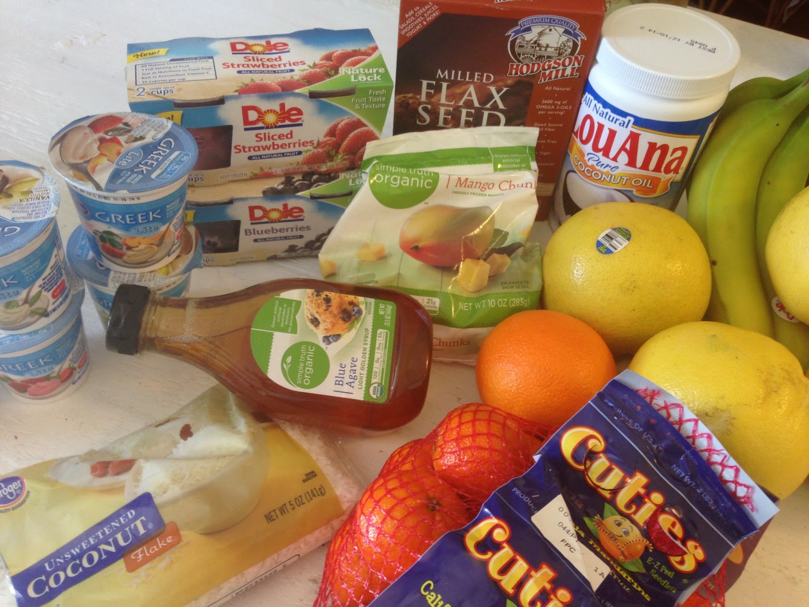 I went to the grocery store for a quick trip and came back with the healthiest things ever! Unsweetened coconut, agave nectar, white grapefruit, cuties, bananas, flax seed, coconut oil, frozen mangos, frozen blueberries, frozen strawberries, Greek yogurt… So good right! And then…
