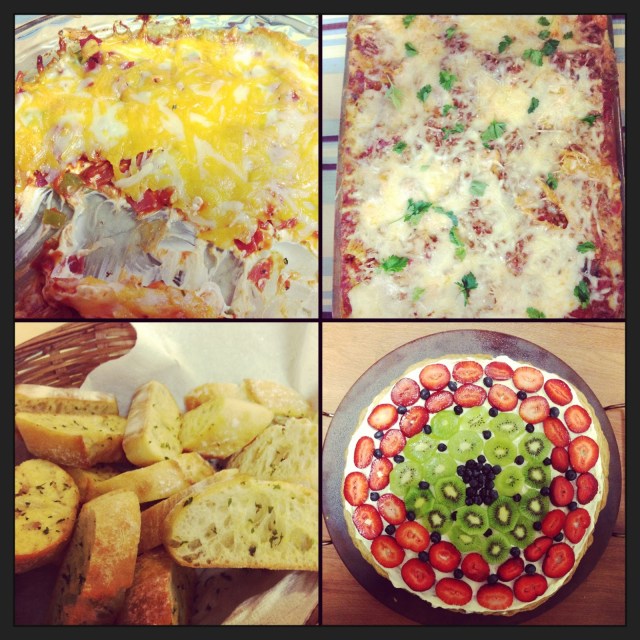 (not pictured) + Garlic Bread + Baked Rigatoni + Salad with Homemade Italian Herb Dressing (not pictured) + Fruit Pizza.