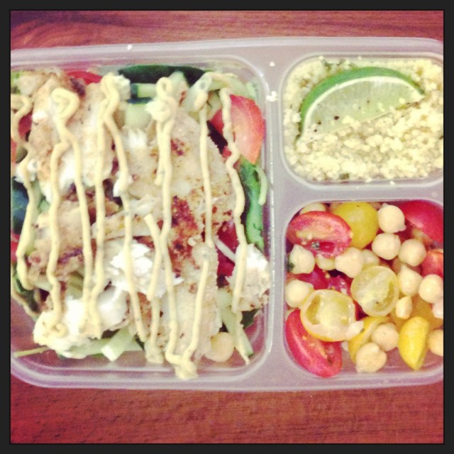 | leftovers made over: fish taco salad + lime pinenut couscous + tomato chick pea salad |