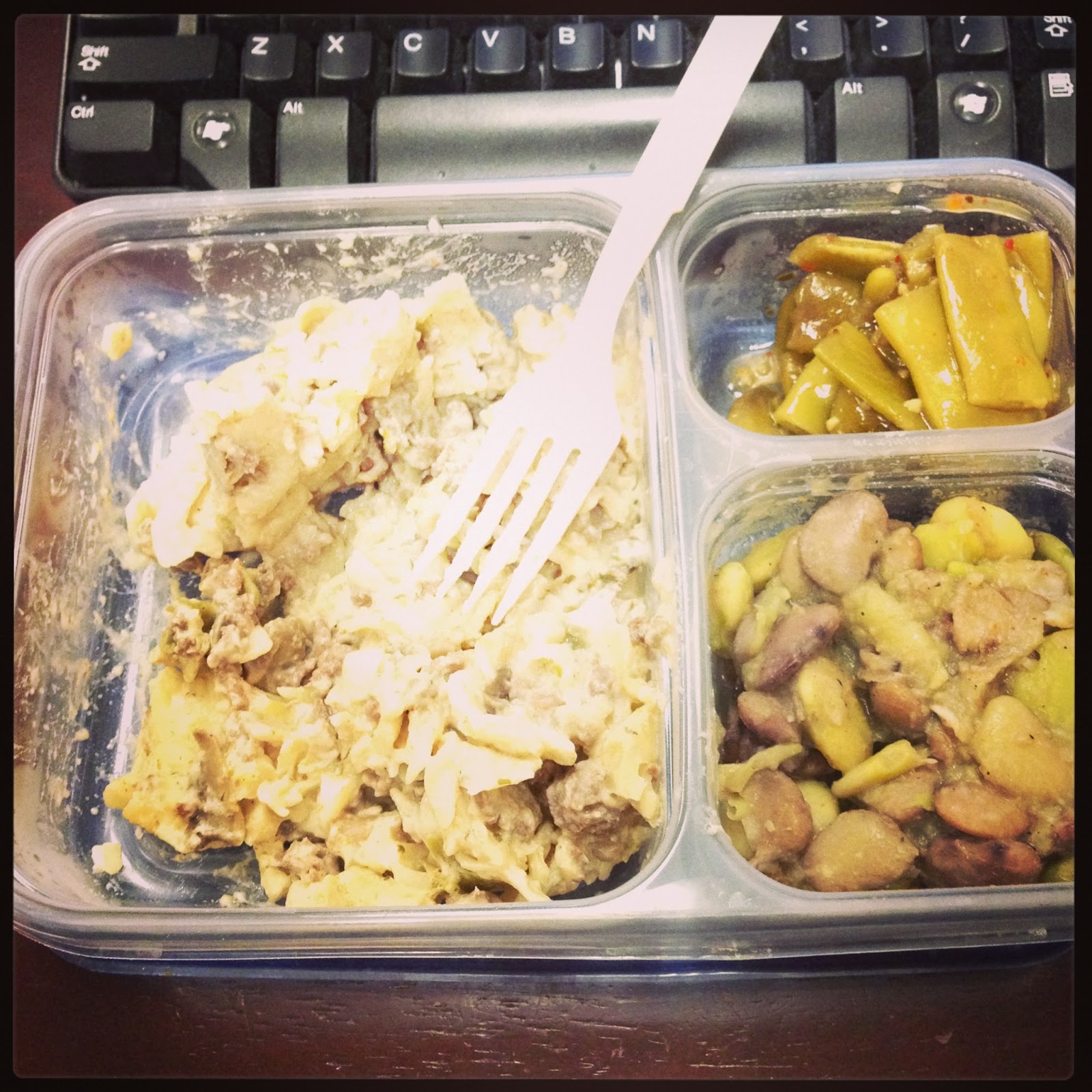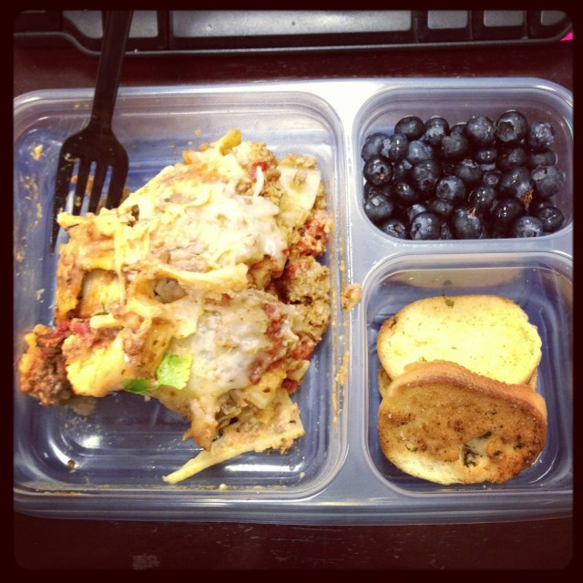 | leftovers: rigatoni baked pasta + blueberries + toast croutons |
