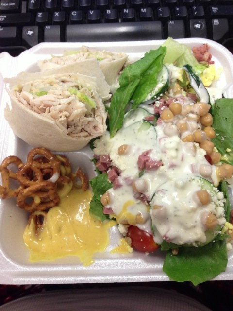 | sometimes you run out of time and have to get lunch on campus, BUT can still make healthy-ish choices: chicken ceasar wrap + side salad + pretzels and honey mustard |
