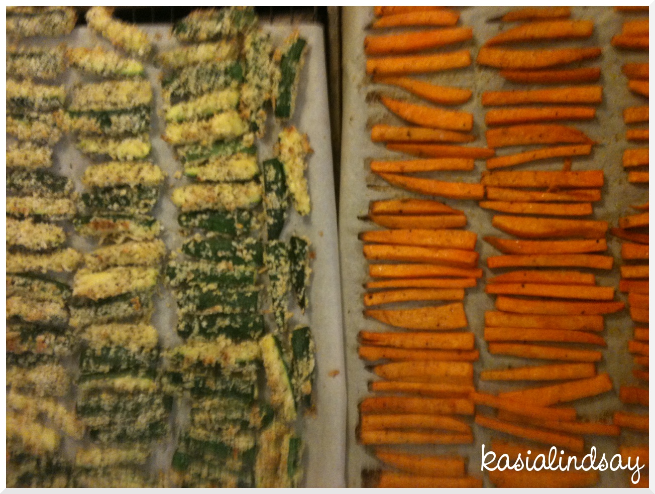 I found mini skewers at the grocery store. I soaked them. And added a piece of onion, fresh pineapple, either red, green, or orange bell pepper, and zucchini, all cut into 1/2-ish inch pieces. I just poured some pineapple juice, probably about 1 cup, the juice of one small lime, zest of half of the lime, little soy, few cloves of chopped garlic in a bowl. I poured the mixer over the kabobs in a baking dish and sprinkled with sea salt and cracked pepper. I marinaded them for a few hours. I roasted them at 375 until they were roasty, still crunchy but the edges getting soft and toasty.