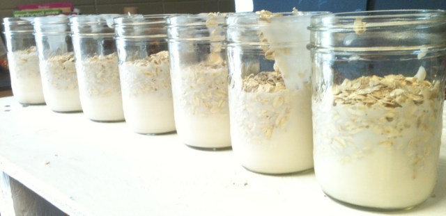 I kept seeing cold overnight oatmeal on Pinterest. I didn’t buy into it at first because I thought the texture might be weird and most recipes called for chia seeds, which freaked me out a little. Chia pets. Chair seeds. They are the same things. I’m not a picky eater, but that made me hesitant. Since then I’ve discovered it’s normal and okay to eat chia seeds. I’m not scared of them, but still haven’t tried them. Apparently they are really good for pregnant women. One day when/if I get pregnant, I’ll add chia seeds to my oats. For now I’ll save my self a trip to a health food store.